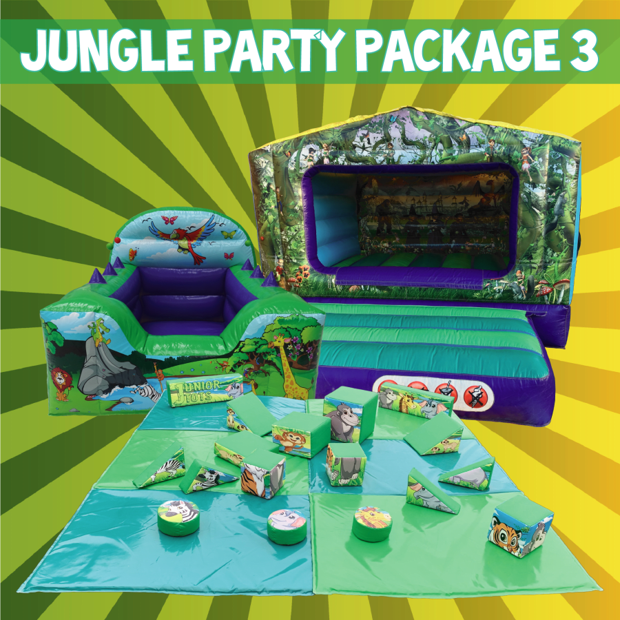 Our Jungle Party Package 3 is designed especially for indoor venues, village halls, community centres and smaller spaces. With a low-height bouncy castle and two matching jungle-themed toddler favourites, this package is ideal for younger children who love safe, colourful and imaginative play.