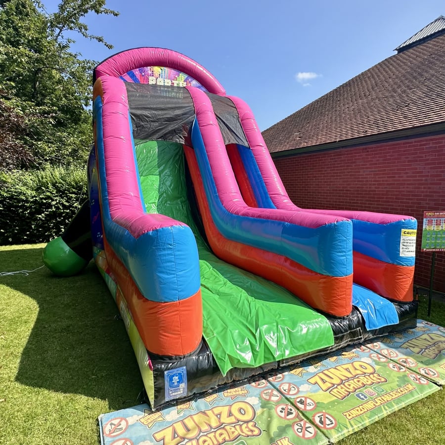 Bring BIG excitement to your event with our exclusive Party 10ft Platform Rush Slide — a high-adrenaline vertical drop slide designed and manufactured only for Zunzo Party Hire! With bright party-themed artwork and an impressive 10ft platform, this slide delivers the ultimate “WOW!” moment for kids and thrill-seekers alike.