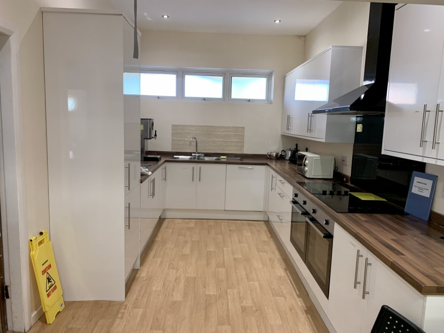 The hall is well-lit, fully accessible, and includes a kitchen area with an additional serving-hatch room, making it convenient for food preparation and party organisation.