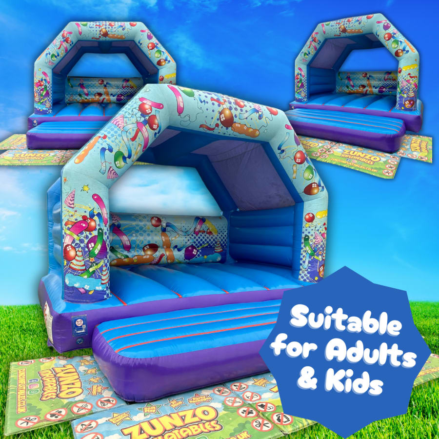 A strong, spacious 15ft x 15ft bouncy castle with colourful balloon artwork and a deeper reinforced bed suitable for adults, teens and children. A fantastic multi-age inflatable perfect for busy events.