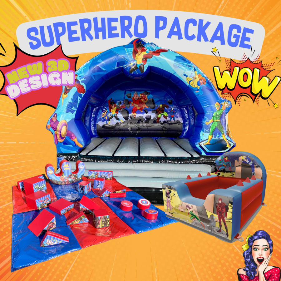 Our Superhero Party Package brings comic-book excitement straight to your event! Designed for toddlers and younger children, this bright, bold and fully themed bundle combines a 3D superhero bouncy castle with matching soft play and a deep ball pool — creating a complete hero-themed play zone.